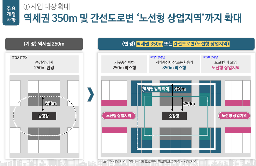 역세권 재개발 사업 대상지를 선정하기 위한 신청 단계에서 토지 등 소유자의 50% 이상의 동의를 받아야 하며 역세권 또는 간선도로변이어야 한다. 도심과 광역, 지역 중심 범역 내 역 또는 2개 이상의 노선이 교차하는 환승역에서 350m 이내에 사업장이 자리 잡고 있어야 한다.