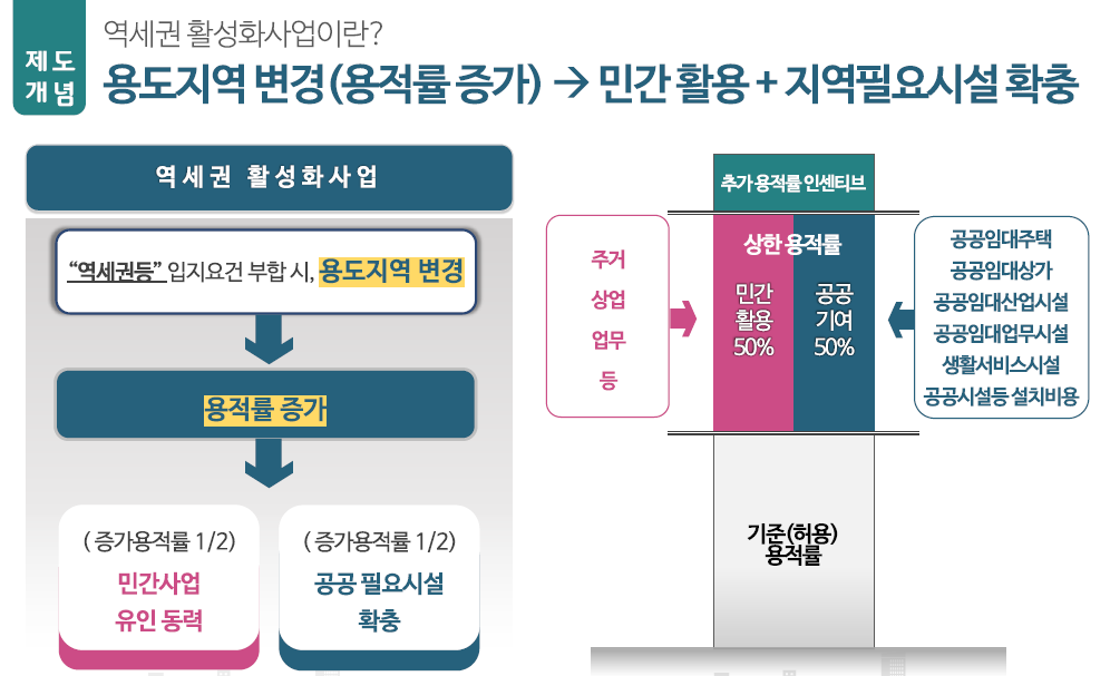 상향 조정된 용도지역으로 인해서 증가한 용적률 중 일정한 면적을 공공임대주택 또는 공공시설, 생활 서비스시설 등 공공에 필요한 시설 확충에 기여하고 증가한 나머지 용적률은 사업 수익으로 전환하는 것이다. 즉, 공공과 민간이 함께 진행하는 윈-윈 구조 사업이라고 할 수 있다.