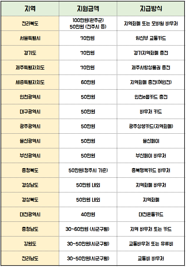 ✔️ 지원 금액 : 보통 1인당 70,000원~ 100,000원 이상이며 지역별로 상이합니다.
