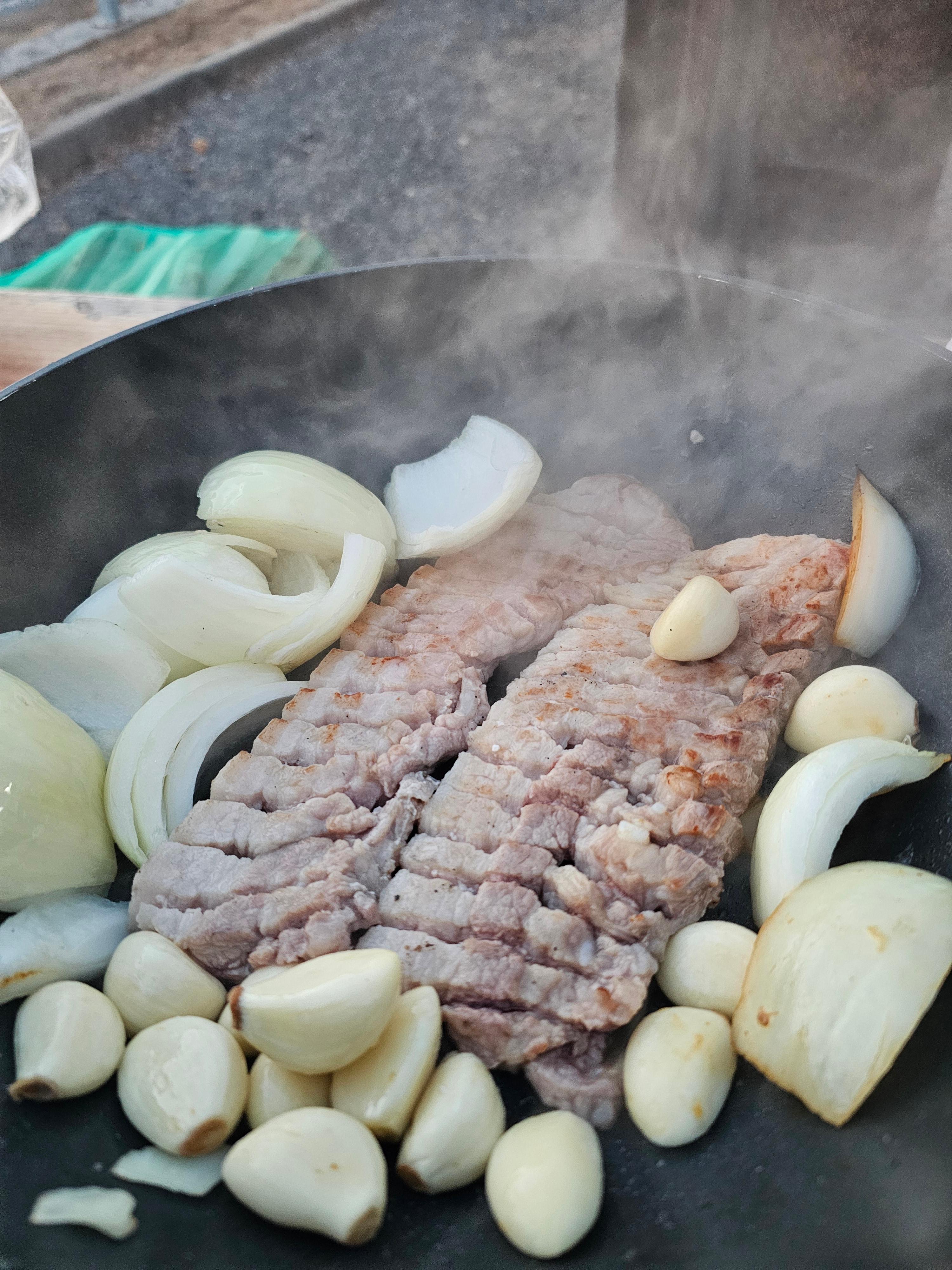 양파를 너무 많이 사가지고 프라이팬에 삼겹살 넣고 같이 구워서 먹었어요.
