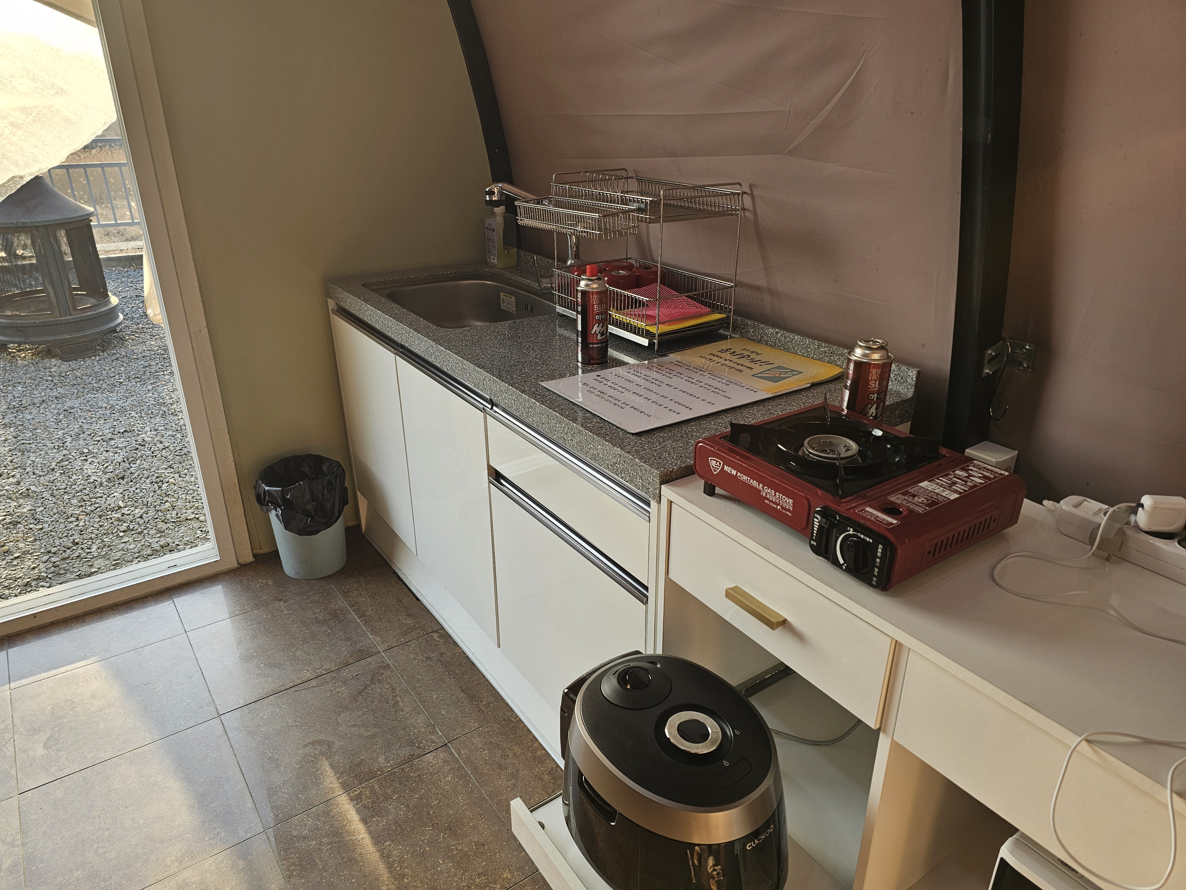 대부분 다 있었고, 수건, 샴푸, 바디워시도 있어요. 예민하신 분들 아니면 캠핑장에 있는 물품들 쓰시면 되는데 만약에 꼼꼼하신 분들은 챙겨가시는 걸 추천드려요. 식기도구, 프라이팬, 냄비 있어요. (심지어 밥통도 있었음)